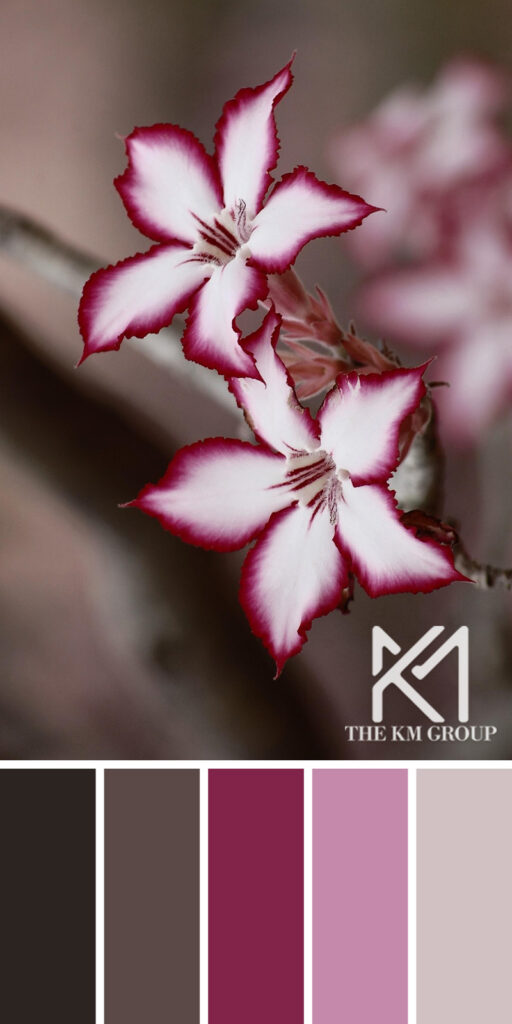 Bold crimson accents frame soft petals in this striking palette, where deep berry and warm taupe tones meet gentle blush and ivory. The contrast of intensity and softness creates a refined balance—ideal for interiors or artwork that aim to be both dramatic and sophisticated.