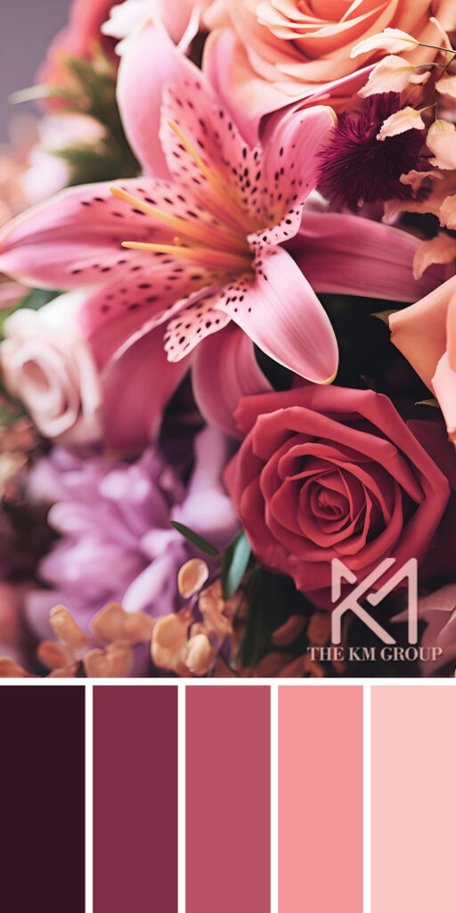 Rich berry tones and soft blush hues intertwine in this romantic palette, inspired by the layered textures of roses and lilies. From deep plum to airy pink, the gradient captures both drama and delicacy—ideal for interiors or artwork that seek warmth, depth, and timeless elegance.