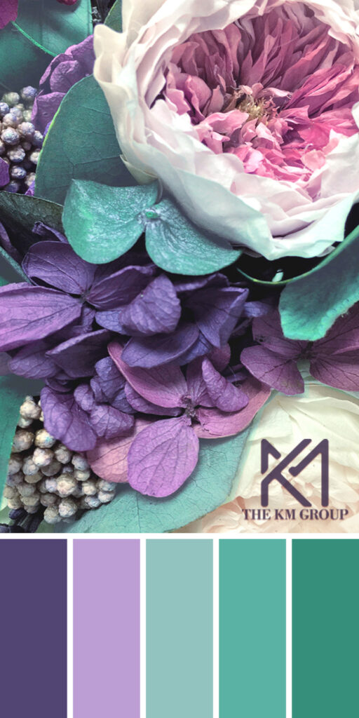 A refreshing blend of violet, lavender, and verdant greens, this palette captures the lush harmony of florals and foliage. The mix of cool purples with serene aquas and teals creates a balanced composition—ideal for interiors or artwork seeking both vibrancy and tranquility.